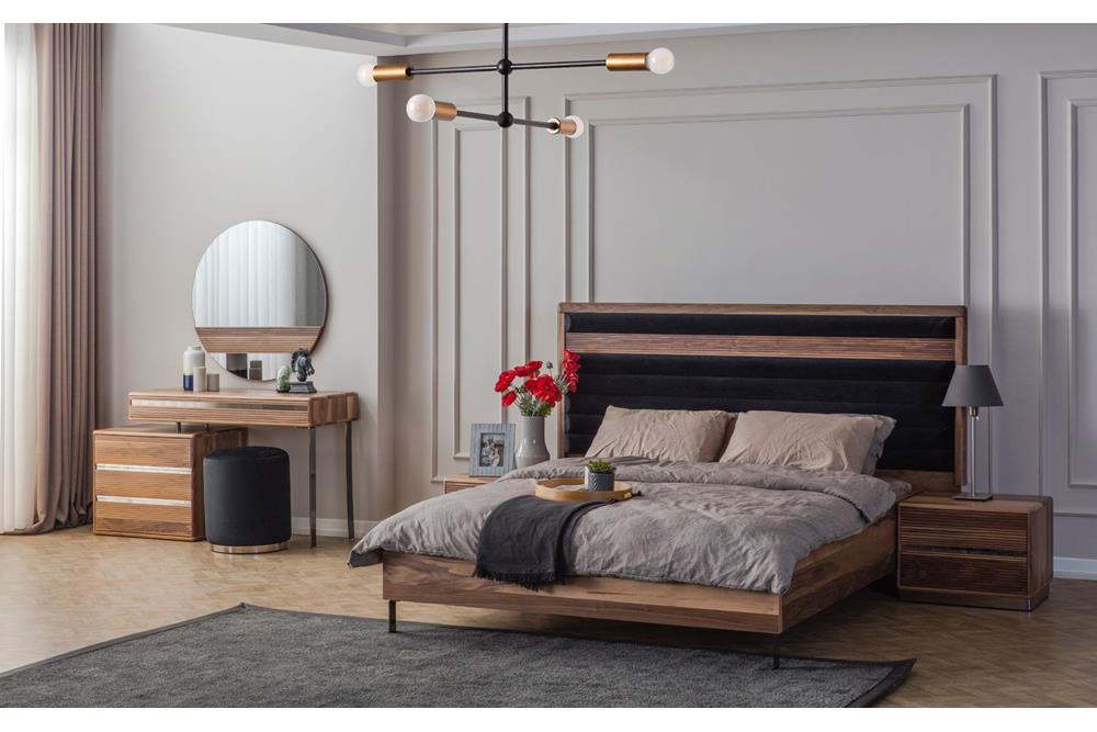 Takım içeriği: 1 adet sürgülü dolap, 1 adet bazalı karyola, 2 adet komodin, 1 adet şifonyer ve aynadan oluşmaktadır.