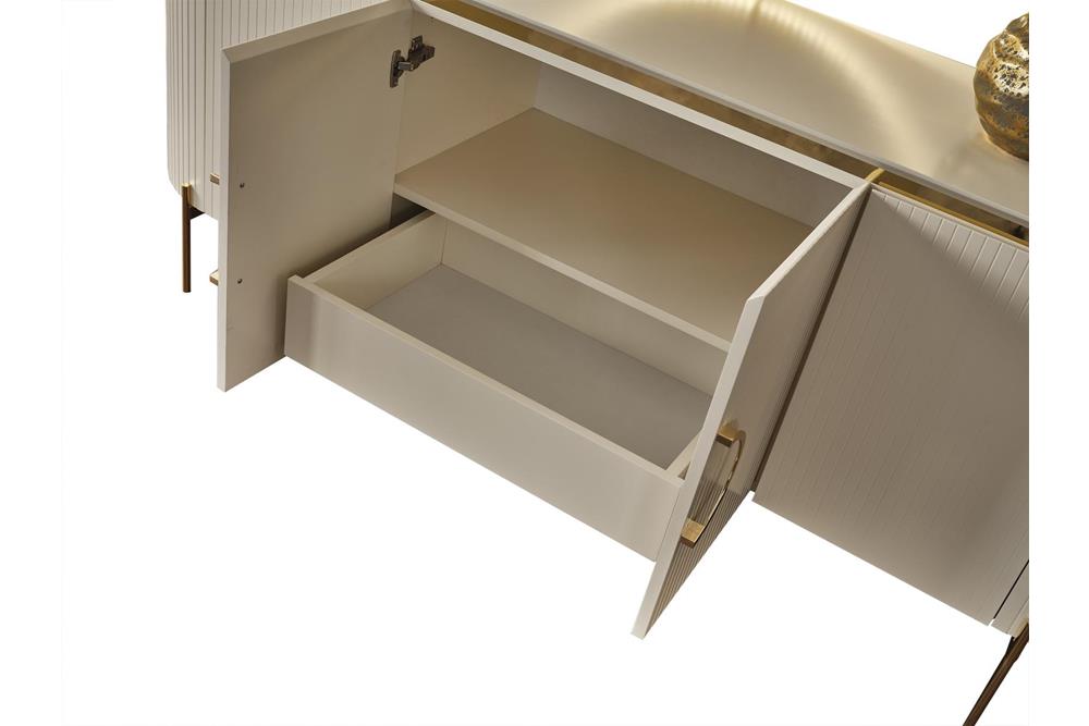 Ünite; üst tabla MDF malzeme üzeri ahşap kaplama ile üretilmiştir. Ön kapaklar MDF üzeri CNC işçilik ile üretilmiştir. Ayaklar metal malzemedir.