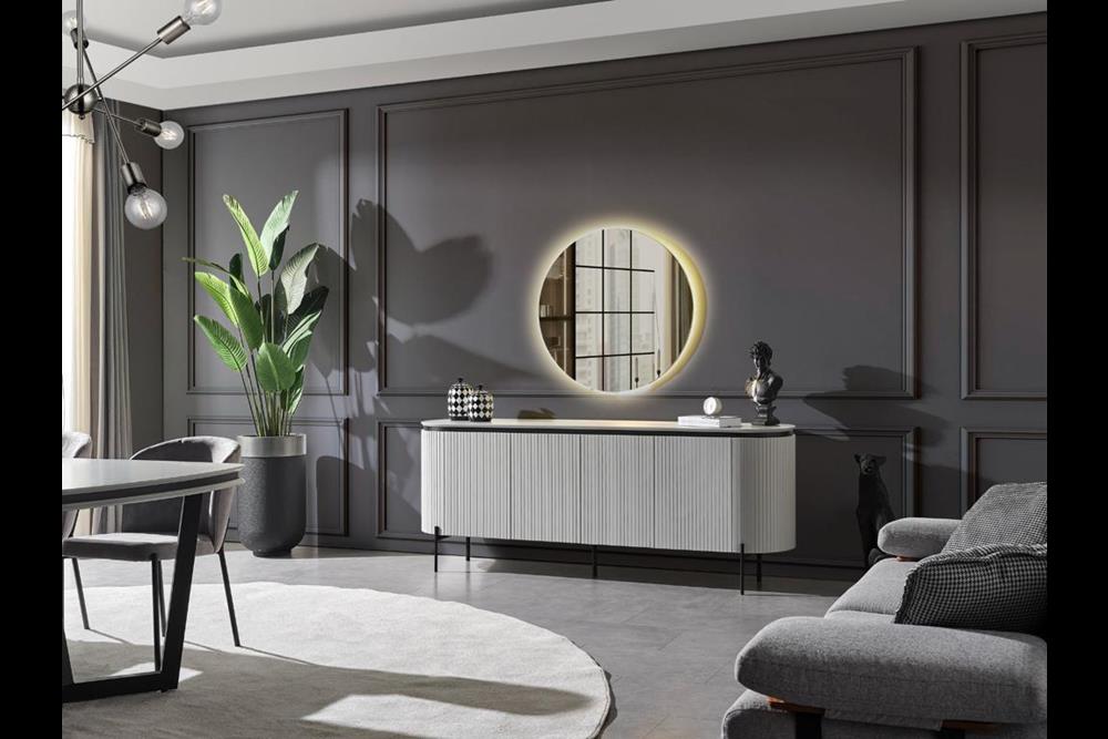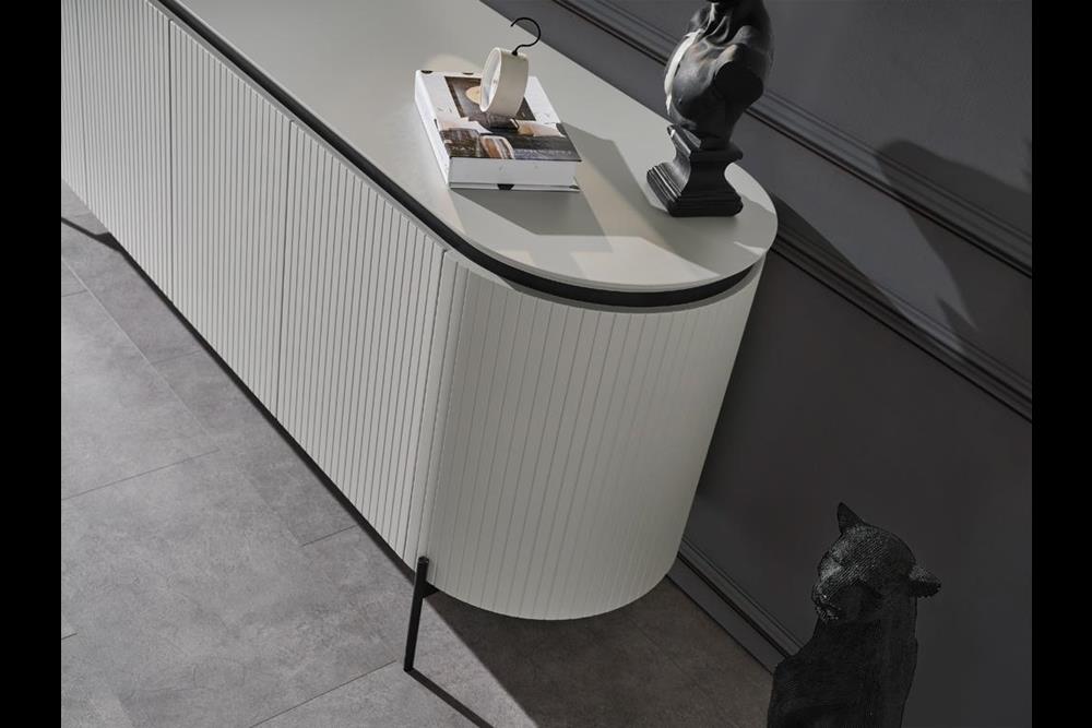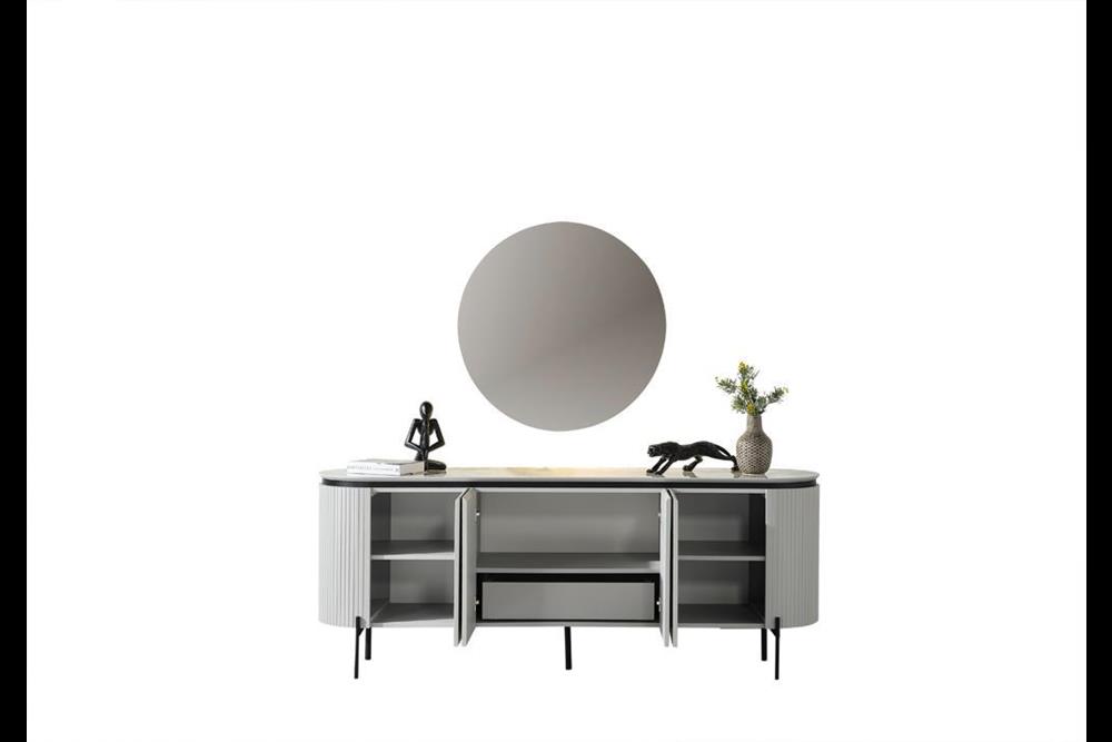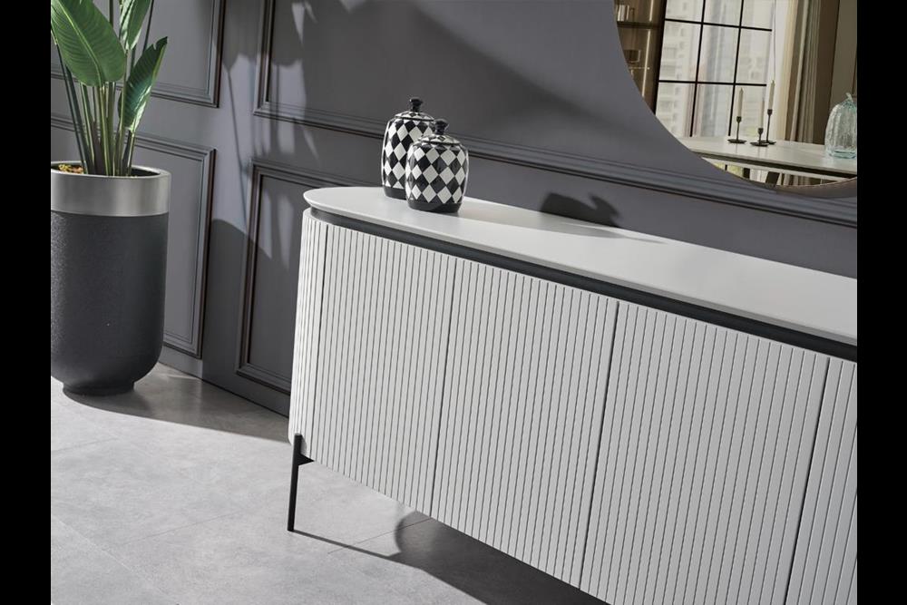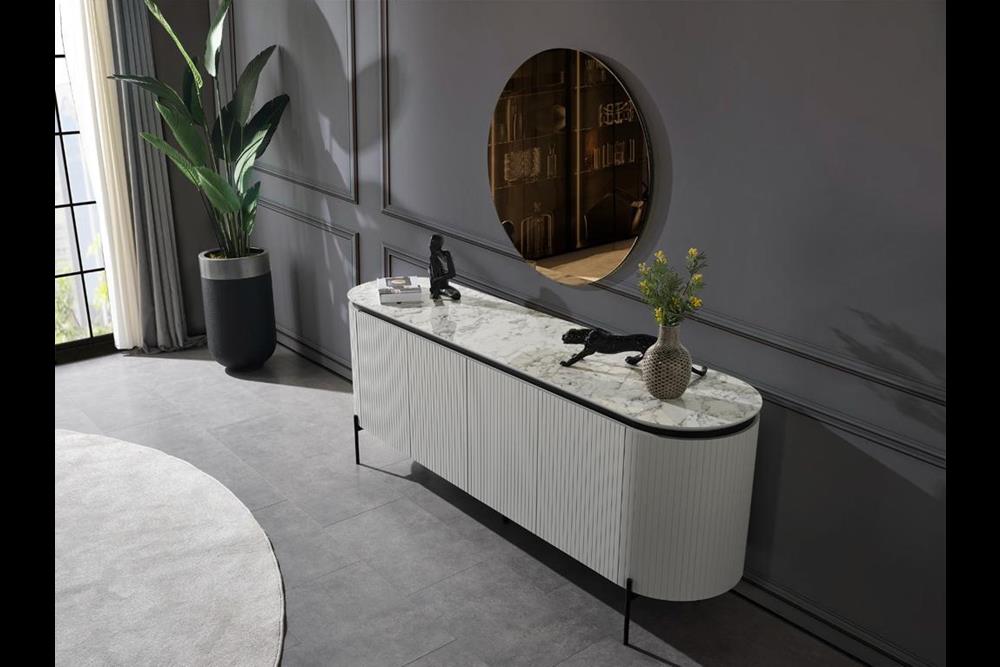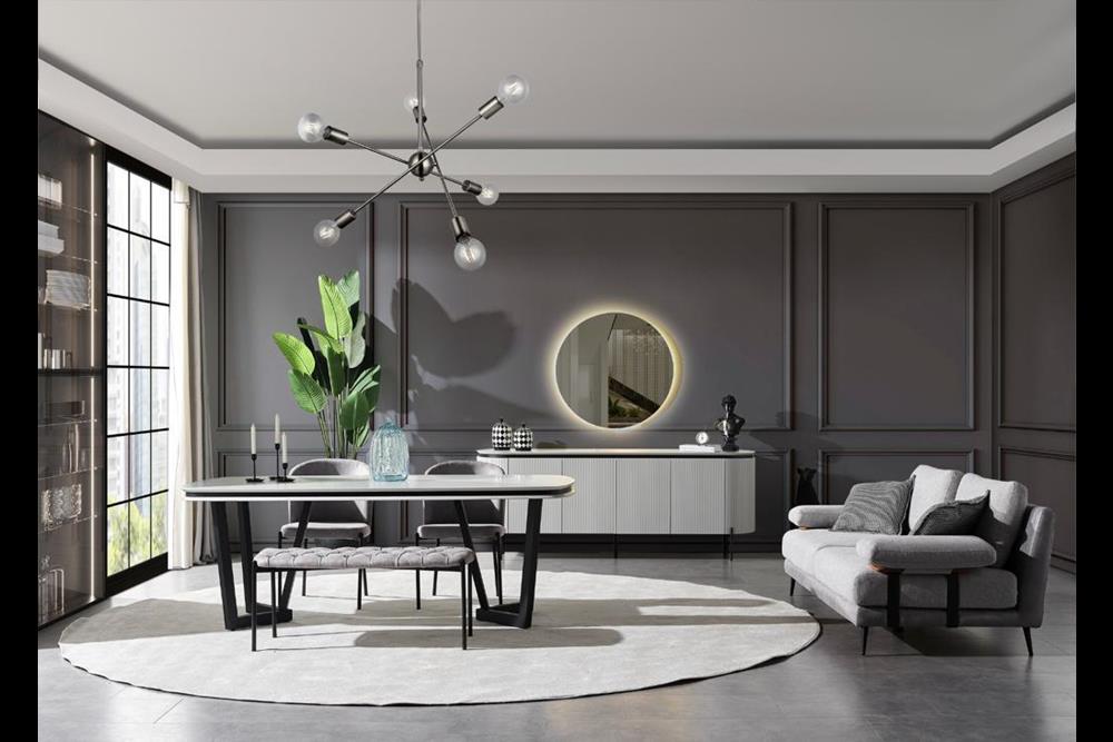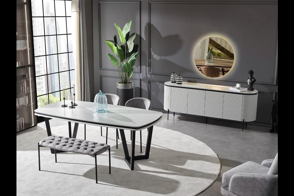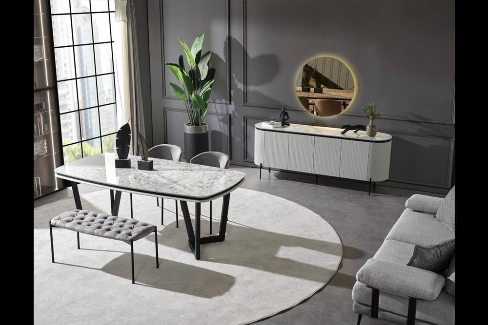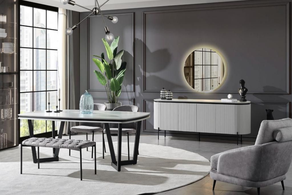 Takım içeriği;1 adet Konsol ve aynası, 1 adet Yemek Masası, 4 adet Sandalye ve 1 adet Benchten oluşmaktadır. TV Ünitesi ve Orta Sehpa opsiyonel olarak satışa sunulmuştur.